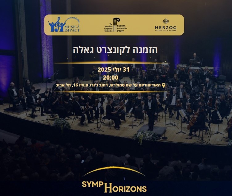 מוזיקה אימפקט ומשרד הרצוג-פוקס-נאמן בשיתוף עם התזמורת הסימפונית ירושלים מתכבדים להזמינכם לקונצרט השנתי לסיכום תכנית SympHorizons 30 סטודנטים נבחרים שעברו תכנית מוזיקלית חברתית לאורך השנה מופיעים בצד התזמורת. קונצרט זה התקיים בהצלחה בברלין בחודש שעבר ועתה מגיע לתל-אביב תכנית: התזמורת הסימפונית ירושליםגל אלתרוביץ', מנצח יאנה לזורנקו, צ'לו איתי גלאי, ויולה עדן צמח, כינור יהושע בניסים, כינור בתכנית: מקס ברוך: כל נדרי, אופ. 47 וויליאם וולטון: פרק ראשון מתוך הקונצ'רטו לוויולה יוהנס ברהמס: פרק שני מתוך הקונצ'רטו לכינור ברה מז'ור אופ. 77 קבלבסקי : פרק ראשון, מתוך הקונצ'רטו לכינור בדו מזו'ר אופ. 48 – הפסקה – ברהמס: סימפוניה מס' 1 בדו מינור, אופ. 6 מתוך הקונצרט בברלין מוזמנים להגיע לקונצרט מיוחד זה. עליכם רק למלא את הטופס למטה וכרטיסים ישלחו אליכם במייל יום או יומיים לפני הקונצרט. שימו לב - מילוי הטופס היא מחויבות להגיע, כי נשמרים לכם מקומות. יש מקומות, אך הם אינם בלתי מוגבלים, וכל הקודם זוכה. יש לציין כי הארגון המזמין הוא אוצר תרבות